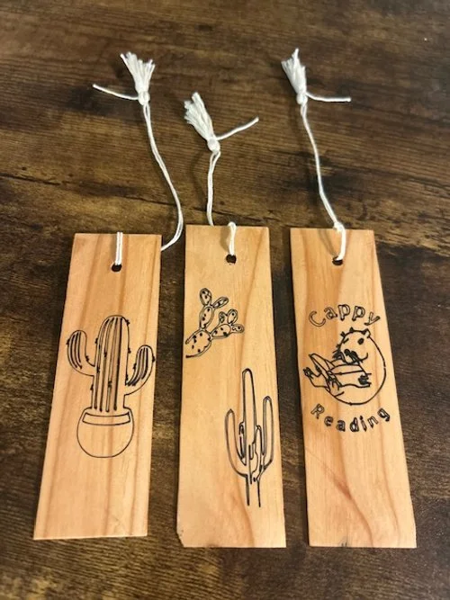 Hand cut, wooden bookmarks with custom designs and handcrafted tassels.