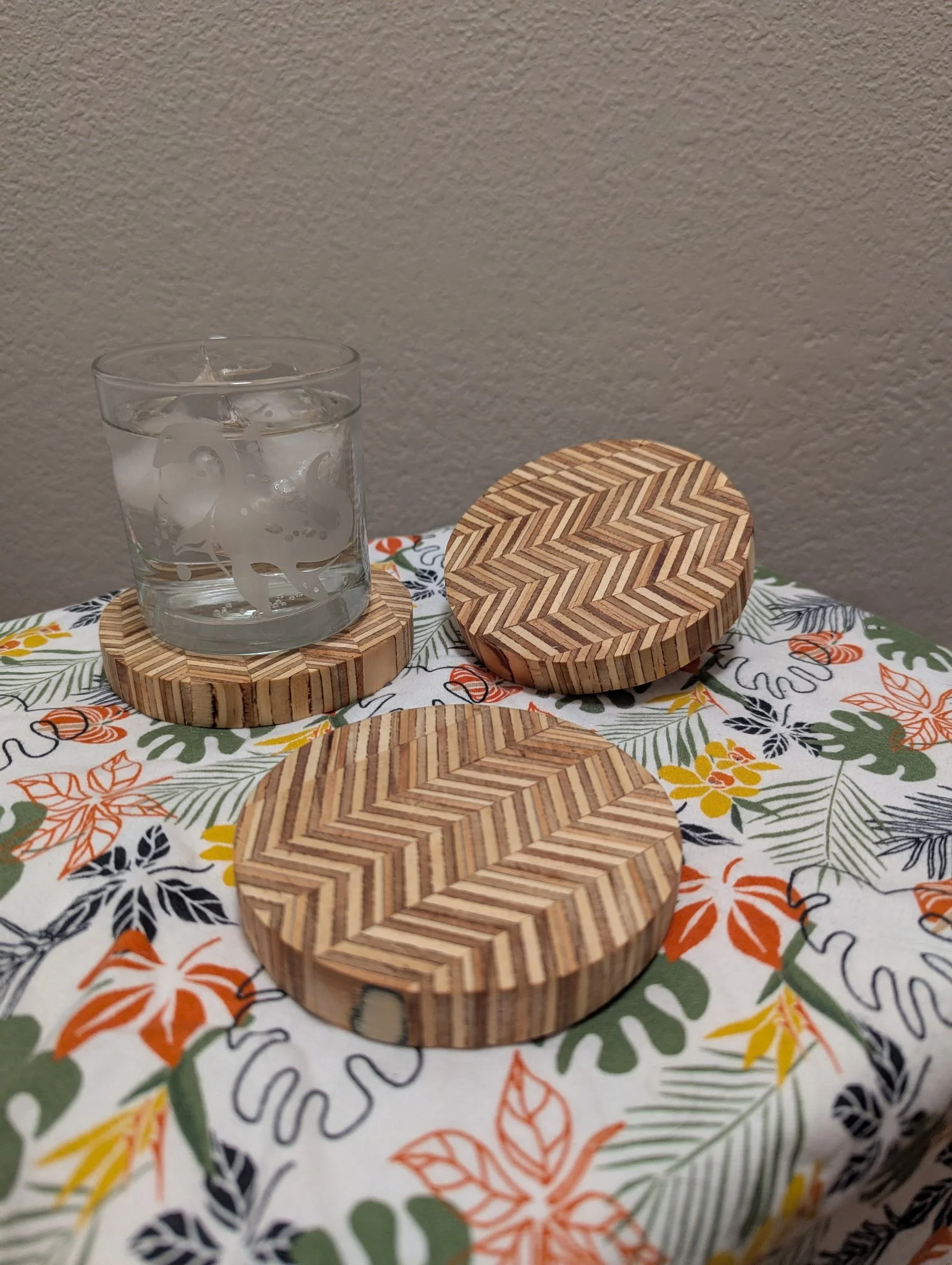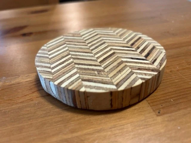 CoastersCoasters made with recycled plywood and other sustainably sourced materials, cut into unique chevron patterns.